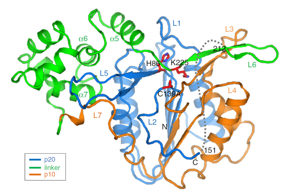 Scientists reveal a critical activation mechanism for a plant metacaspase that offers a pathway for more sustainable crops and biofuels. The AtMC4 metacaspase enzyme comprises three domains, including a “linker” domain (green). A side chain in the linker domain blocks the enzyme’s active site until activated by Ca2+, thus ensuring the tight regulation of this protease. [Reprinted under a Creative Commons Attribution 4.0 International (CC BY 4.0) license from Zhu, P., et al. 2020."Structural basis for Ca2+-dependent activation of a plant metacaspase." Nature Communications 11 (1), 2249. DOI:10.1038/s41467-020-15830-8.]